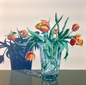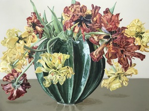 2021Een vaas met uitgebloeide tulpen. Juist in deze fase, waarin we vaak de bloemen weggooien, toont zich de schoonheid. Dit schilderij gaat over vergankelijkheid. Wij bestaan als mens vanwege de vergankelijkheid, en de vergankelijkheid is mooi om te tonen.