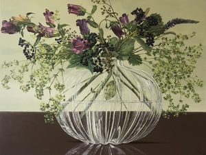 2021acrylschilderij van een glazen vaas met vrouwenmatel en campanula.